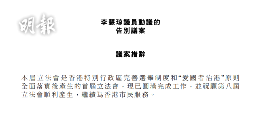 本報正向提出動議的民建聯李慧琼查詢,李慧琼回覆稱,確實就告別議案收到來自不同黨派議員的意見,目前綜合考慮及溝通中,有結果將向大家交代。。