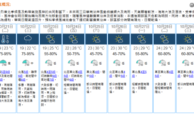 在風神及季候風的共同影響下,未來數日本港風勢持續頗大,漸轉多雲有雨,周二(21日)及周三(22日)初時雨勢有時較為頻密,周二至周四(23日)市區氣溫會顯著下降至19°C左右,新界再低兩三度。