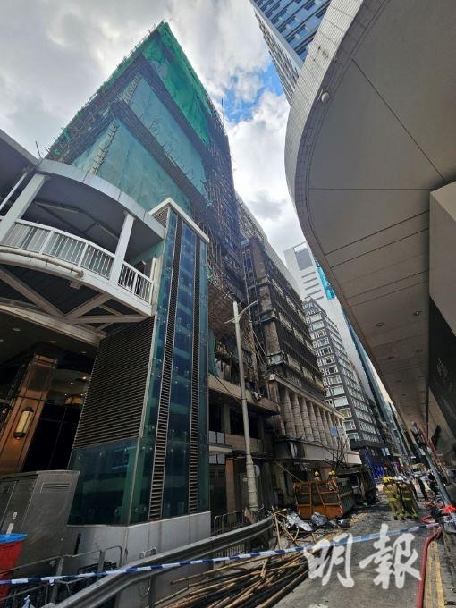 中環華懋大廈昨日(18日)發生三級火,火勢沿外牆棚架迅速蔓延,烈焰沖天。現場一段砵典乍街今日(19日)仍然封閉,被焚毁竹枝及雜物散落一地,消防在現場蒐證,起火原因有待調查。火警中受傷送院的3男1女,截至今日深夜,當中23歲姓倪男子情况嚴重,另3人則情况穩定。屋宇署則表示,正調查包括棚架所採用的保護網是否合規,若發現有人違反《建築物條例》的規定,或考慮提出檢控或進行紀律處分程序等。