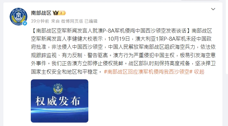 即時兩岸 澳洲P8A軍機飛入西沙領空 解放軍反制驅離 (17:44) 發佈於 4 天 前 2025 年 10 月 20 日 By 明報 解放軍南部戰區空軍發言人李健健通報,澳洲1架P8A軍機10月19日未經中國政府批准,非法侵入中國西沙領空,南部戰區組織海空兵力,依法依規跟蹤監視、有力反制、警告驅離。 李健健強調,澳方行為嚴重侵犯中國主權,極易引發海空意外事件。「我們正告澳方立即停止侵權挑釁。戰區部隊時刻保持高度戒備,堅決捍衛國家主權安全和地區和平穩定。」(南部戰區) 相關文章:南海爭端澳洲編輯推介西沙群島軍機 Up Next 王文濤與荷蘭經濟大臣通話 促妥善解決安世半導體問題 (23:23) 不要錯過 全國秋糧收穫近七成 (22:45) 繼續閱讀 贊助商 猜你喜歡 特當面批評澳大使陸克文:我不喜歡你 國防部批澳洲軍機闖西沙 已提出嚴正交涉 (09:00) 澳洲男子被控偷43隻Labubu 涉款約4.5萬元 (16:52) 澳洲公路檢疑似中國火箭殘骸 特朗普向澳洲前總理陸克文說「我不喜歡你」 澳外長稱屬開玩笑 (15:31) 澳星簽升級版戰略伙伴關係 增防務AI合作