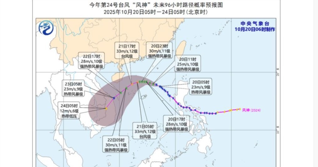 中央氣象台表示,「風神」現時最強中心風力有9級(時速約每小時83公里),最強可達強熱帶風暴或颱風級。中央氣象台今早6時續發布大風黃色預警,並預料明日(21日)日間受南下冷空氣影響,「風神」將在南海中北部海面轉向西南方向移動,趨向越南中部沿海,強度逐漸減弱。