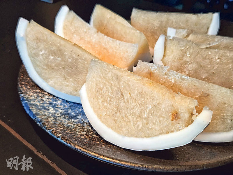 翻查資料,品牌在深圳設有多間分店,大悅城店為新開業分店,採訪時就連高德地圖亦搜索不到。湯底有原味、竹笙、竹笙馬蹄及金枕頭榴槤4款,湯頭味道跟同仁四季相似,但好戲在後頭,當雞肉煲得愈久,雞味慢慢滲進湯內,愈飲愈有雞味。另一驚喜是,一般餐廳在客人喝完椰子雞湯後,會加滾水煠煮其他食材,又或額外付費使用椰子水;江南椰林則是免費添加雞湯,因此配料煠煮後均保持淡淡雞味。