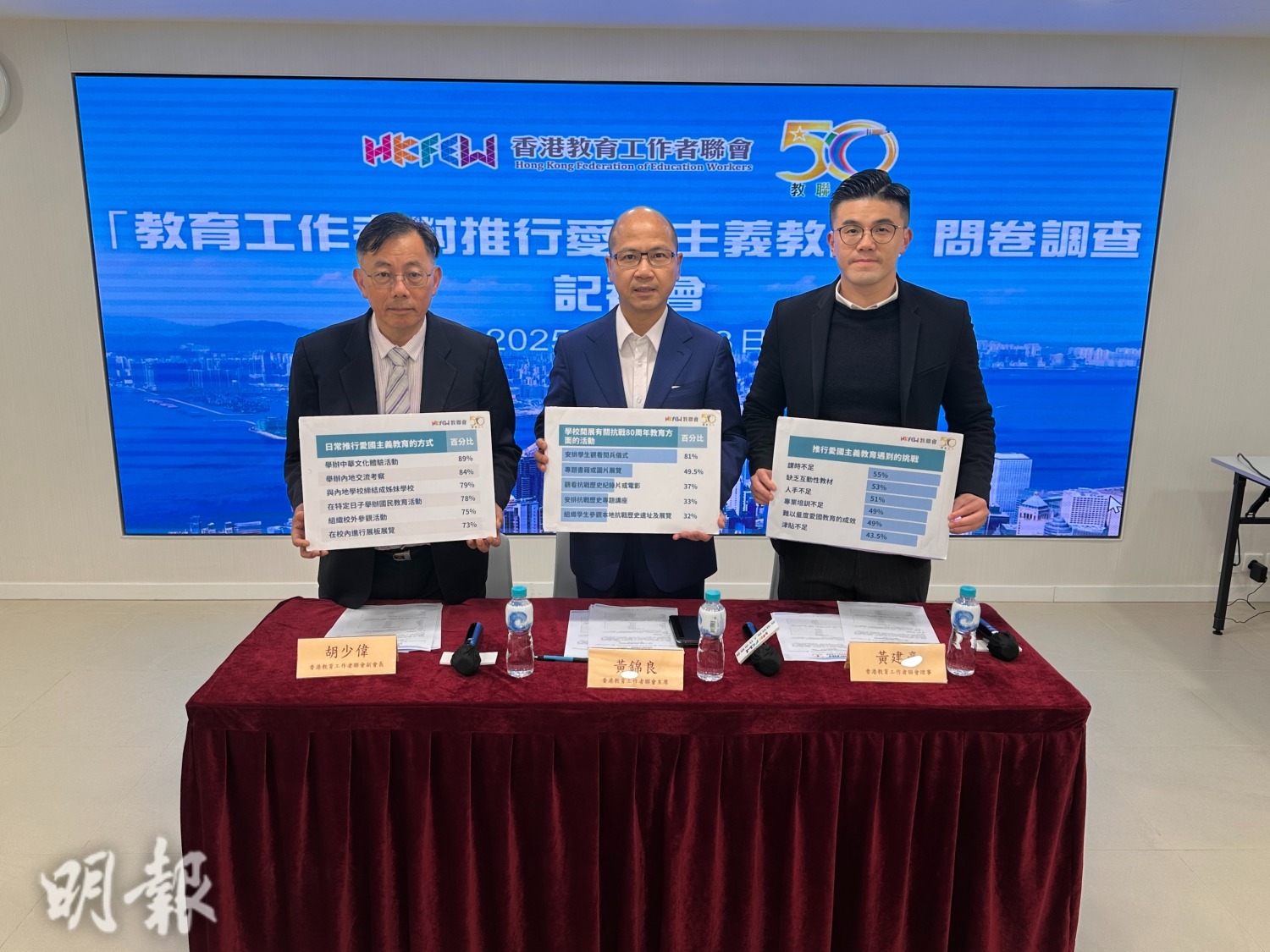 教聯會今午舉行記者會公布愛國主義教育調查,原定鄧飛亦會出席,但最終改為教聯會副會長胡少偉出席,同場亦有黃錦良和教聯會理事黃建豪。有學界人士早前預測黃建豪將參選,他澄清「完全無諗過要參選」,指本學年起在其學校出任新崗位,故想集中精力於工作,但會繼續為教聯會出力。