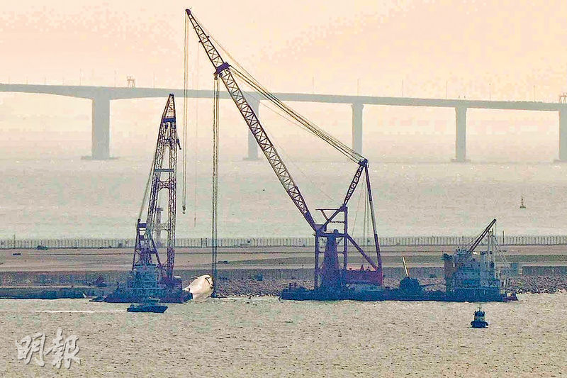 兩艘內地打撈船繼前日吊起失事貨機機尾、其中一個引擎及起落架後,機管局昨表示打撈團隊昨早再在機場北跑道對出水域吊起被撞機場保安巡邏車殘骸,並放置打撈船上,警方正調查。