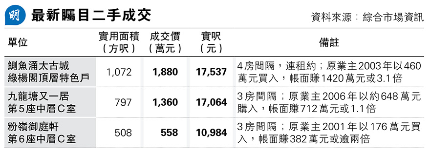 【明報專訊】低息環境持續,二手物業市場不乏投資者入市;中原高級資深區域營業經理王秀芬表示,港島東指標屋苑、鰂魚涌太古城新錄特色戶成交,為綠楊閣頂層複式連天台特色戶,屬實用面積1072方呎,4房間隔,向東南望內園景,以1880萬元連租約易手、實呎17,537元,據悉買家為投資者,以單位現月租約5.2萬元計,買家料享租金回報約3.3厘;至於原業主,於2003年以460萬元買入單位,持貨22年,帳面獲利1420萬元或近3.1倍。