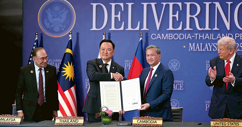 【明報專訊】東盟峰會周日(26日)在吉隆坡揭幕,但焦點人物仍是事隔7年重臨的美國總統特朗普。特朗普早上與東道主馬來西亞首相安華同場見證泰國和柬埔寨簽署其口中的「和平協議」,但泰國用詞有所淡化,令人揣測泰柬雙方實際上仍未達成真正協議。其後,特朗普在東盟峰會場邊與各國領袖會面,跟馬來西亞和柬埔寨簽署對等貿易協議,跟越南和泰國則簽署對等貿易協議的框架文件,確認部分貨物可享「零關稅」待遇。美國跟馬、泰兩國另外還簽署關鍵礦物合作的諒解備忘錄。