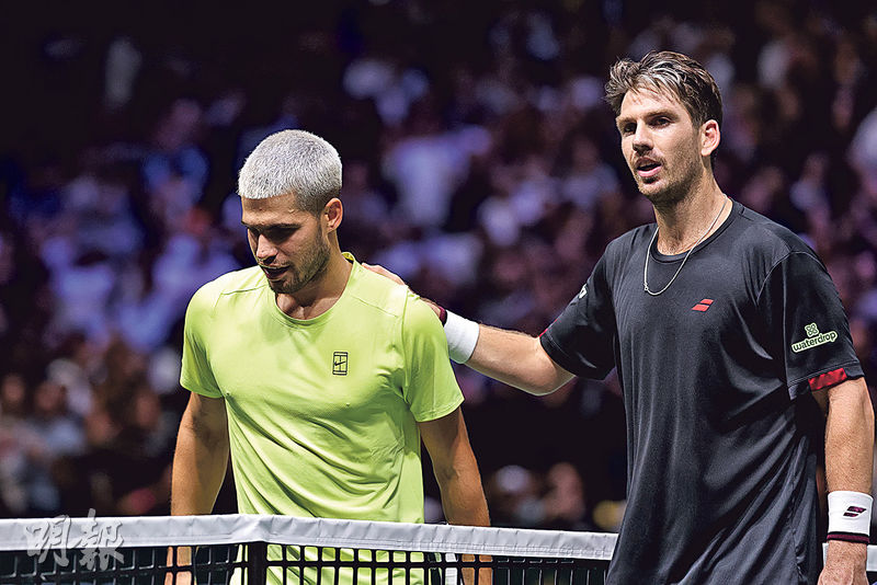 【明報專訊】西班牙籍「世一」卡路士艾卡拉斯(左)於ATP世巡賽千分級的巴黎網球大師賽以頭號種子直入男單次圈32強下,昨首仗意外以6:4、3:6、4:6,盤數1:2反負英籍好手諾利(右)出局,是他繼今年3月在邁阿密大師賽後再嘗次圈首仗止步。賽後艾卡拉斯承認此仗表現令自己失望,諾利則形容這場或是他生涯最佳勝利。至於同日費利斯、舒爾頓及羅比夫等種子球手均順利晉級16強。