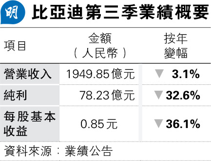【明報專訊】比亞迪(1211)公布第三季業績,營業收入按年跌3.1%至1949.85億元(人民幣,下同),低於市場預期的2159.23億元;純利下跌32.6%至78.23億元,亦遜預期的96.19億元。每股基本盈利0.85元,按年減少36.1%。