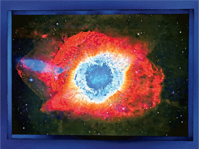 其中一系列天文影像,出自星空攝影師宋志新的鏡頭,捕捉了星體誕生、聚集或死去等形態,千變萬化。在燈箱下,噴墨印刷膠片更顯清晰、飽和度高、光芒斑斕;然而寫實之外,宋志新特別拍下自然又獨特的形狀,有些星體看起來像瞳孔或骨骼結構,彷彿宇宙各種奧妙都是同本同源,又互相呼應。