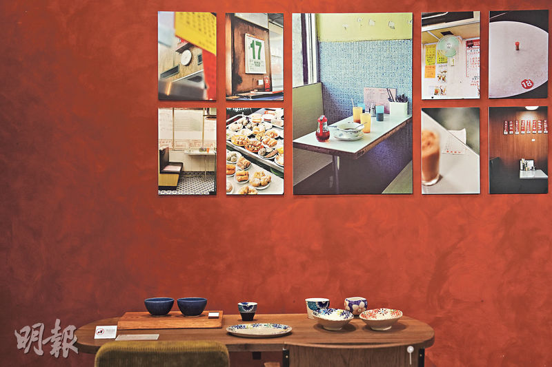展覽分為5個區域,首先映入眼簾的是Enoch的展區「茶事日常」。他的鏡頭聚焦於與「茶」相關的場所,從茶樓到茶餐廳,捕捉那些看似微不足道的物件,如夾在玻璃下的手寫單,色彩斑斕的塑膠碟,逐頁手撕的掛牆日曆或是飽經風霜的馬賽克地磚等。他相信,文化認同並非一兩件事物能夠概括,而是由日常生活中一連串看似微小的細節慢慢構成。