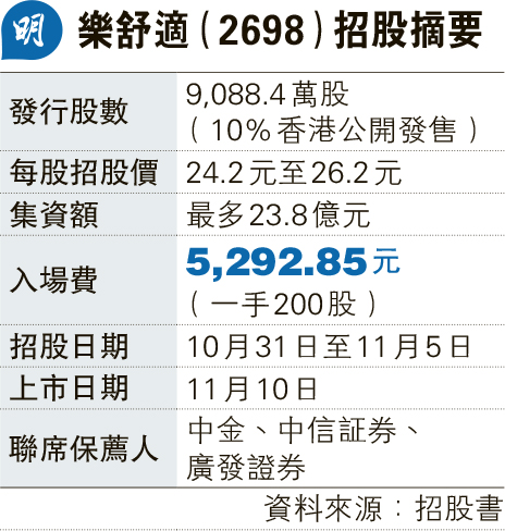 【明報專訊】「非洲紙尿片之王」樂舒適(2698)昨日起至下周三(11月5日)招股,全球發售9088.4萬股,採用不設回撥的機制B、其中一成於香港公開發售。每股招股價介乎24.2元至26.2元,集資最多23.8億元。股份將於11月10日掛牌,中金(3908)、中信証券、廣發證券(香港)為聯席保薦人(見表)。