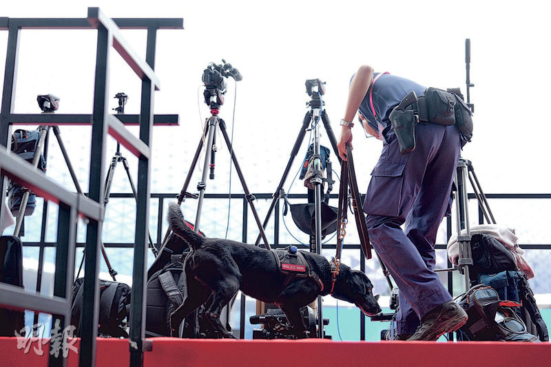 傳媒要朝早9點15分前到啟德體育園中央廣場集合,Emily約9點喺傳媒入口登記後就開始安檢,先由保安檢查隨身物品,再以金屬探測棒探測身上有無金屬,本以為入到場就完事,點知警方突然要求傳媒暫時離開傳媒看台,並要放低隨身物品喺看台上,隨後派出警犬上看台搜索。