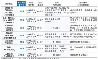 是次比較的稅貸中,東亞稅季貸款的實際年利率可低至1厘,螞蟻銀行(香港)分期貸款(稅季優惠)的實際年利率更可低至0.68厘(見表1),惟要留意要獲得此實際年利率,借貸額往往要逾100萬元。如上述的東亞稅季貸款的1厘實際年利率,便是以貸款額400萬元,每月平息0.045厘及還款期12個月計算。