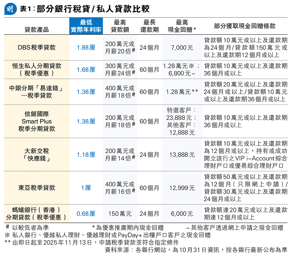 【明報專訊】隨着納稅人陸續收到稅單,最近各銀行相繼推出稅貸產品,個別稅貸的實際年利率更可低於1厘。要留意的是,銀行宣傳的最低稅貸利率,往往是以數百萬元的最高借貸額計算,更有可能是特選客戶方可享有的優惠利率,是次格價會以借貸額50萬元及100萬元的實際年利率作出比較。