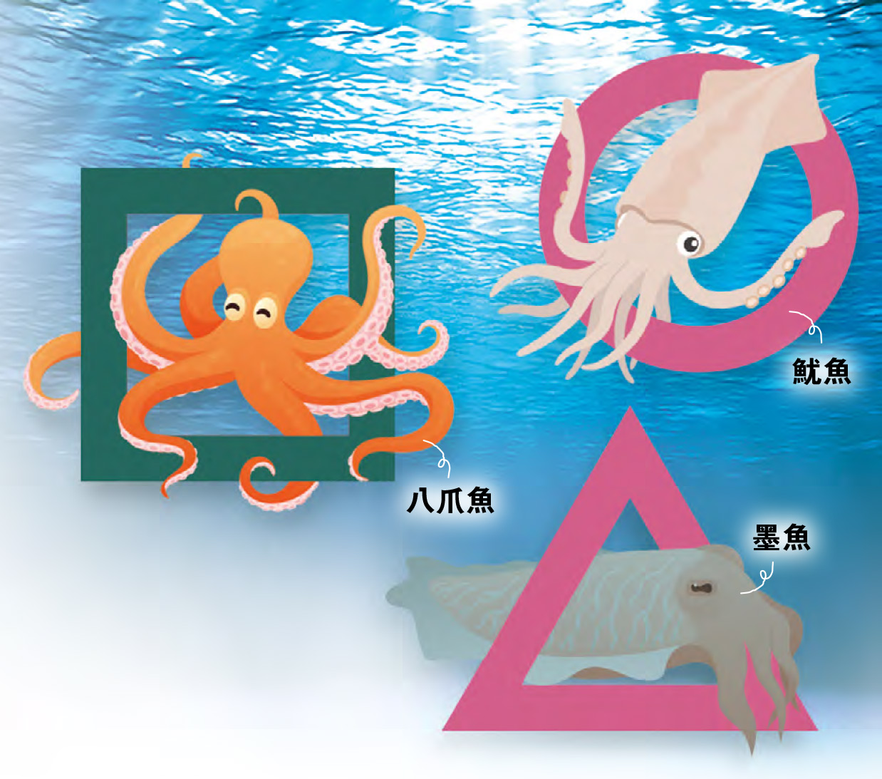 魷魚、墨魚、八爪魚雖然都稱為「魚」,但都不屬魚類。根據香港漁農自然護理署資料顯示,三者均屬軟體動物中的頭足綱(Cephalopoda),觸手/腕足長在頭部,能靈活地運用觸手和腕足捕捉食物。魷魚、墨魚、八爪魚皆有墨囊,每當受到威脅便會噴出墨汁,以分散敵方注意及逃走。