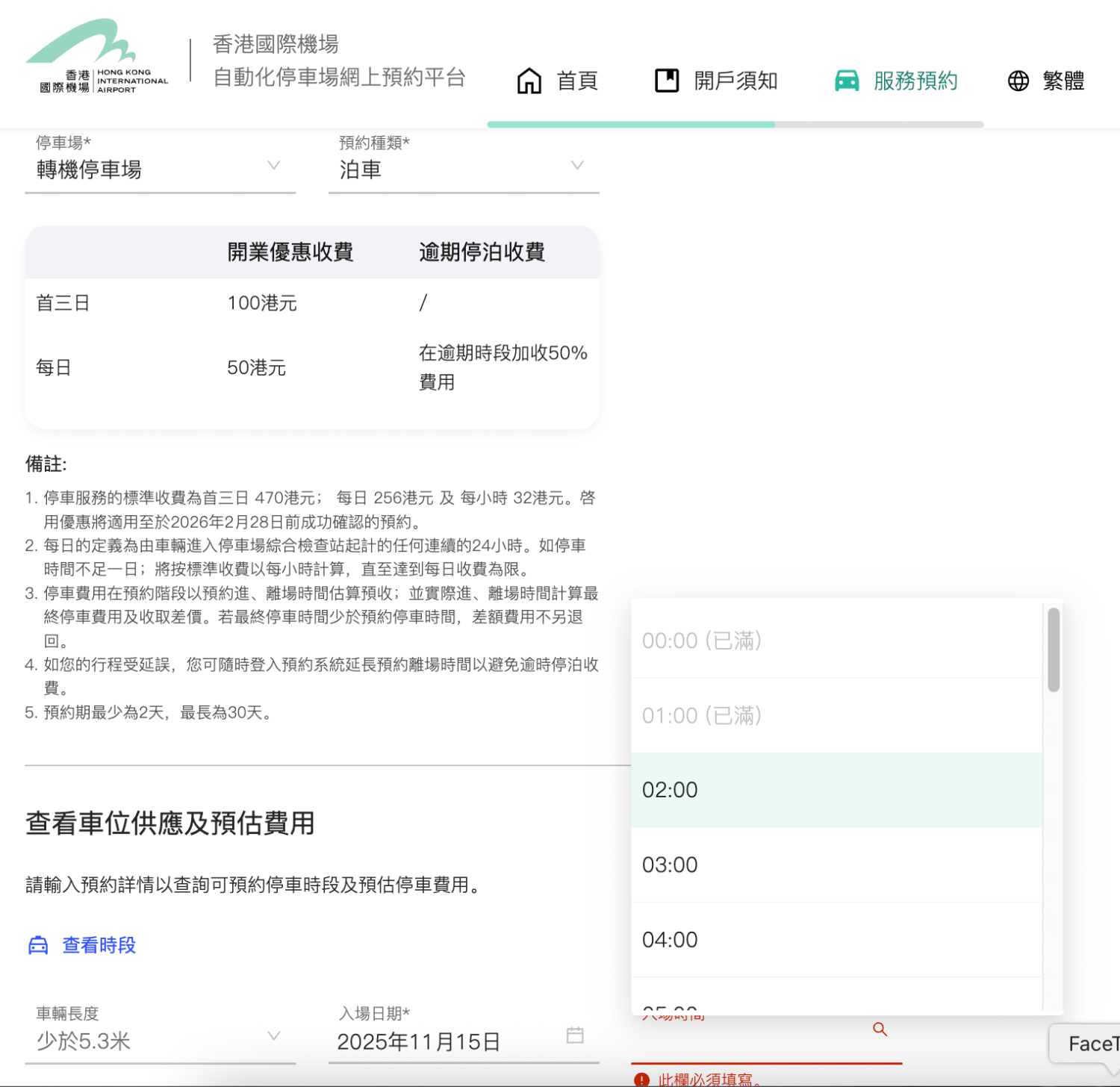 粵車每日可預約泊車轉機、送機或接機三項服務其中一項﹐網上預約平台每次可預約未來30日時段。
