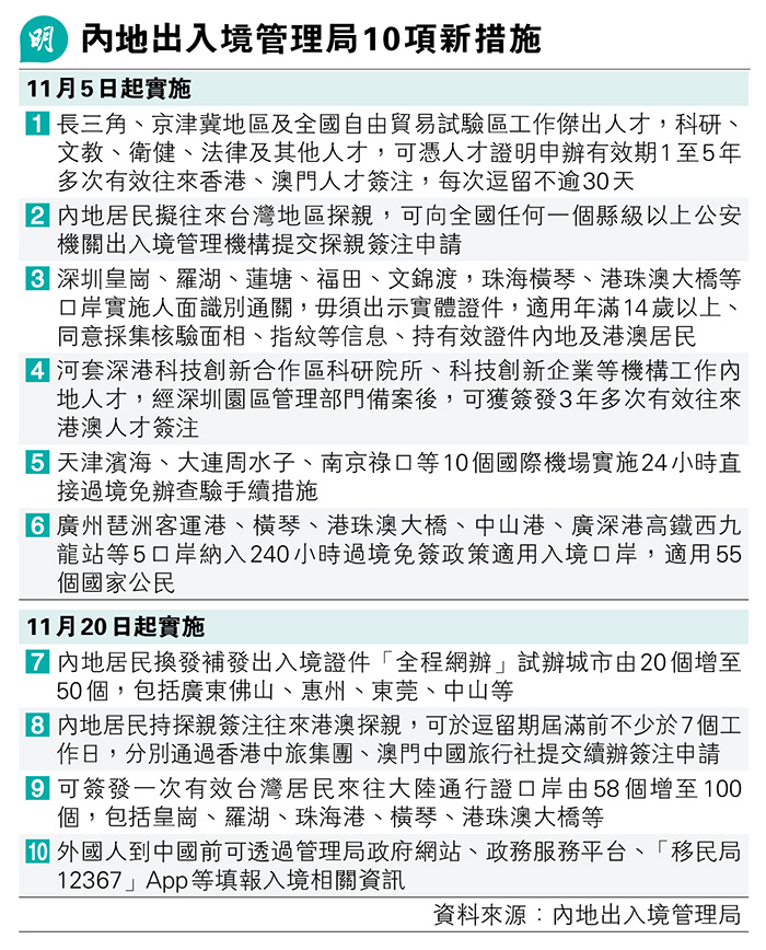 【明報專訊】內地出入境管理局昨公布10項移民及出入境管理服務政策新措施,其中涉及往來港澳人才簽注政策適用範圍,由明日(5日)起擴大至長三角、京津冀地區,以及全國所有自由貿易試驗區;河套深港科技創新合作區科研院所、科技創新企業等機構工作的內地人才,經深圳園區管理部門備案後,也可獲簽發3年人才簽注。特區政府歡迎內地當局宣布一系列創新舉措,會繼續與內地當局保持緊密溝通。有立法會議員表示措施主要便利內地人才訪港;有科技界人士則相信有助吸引創科人才到港。