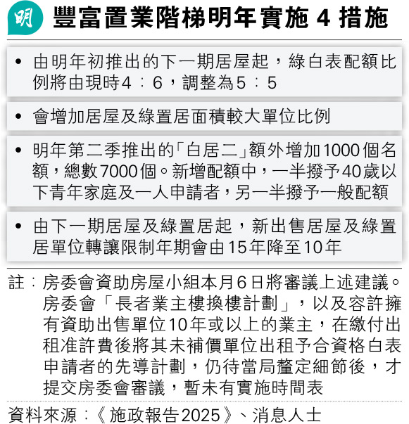 【明報專訊】今年《施政報告》提出6項豐富置業階梯措施,其中4項擬明年初開始落實。消息稱,明年初推出居屋綠白表配額由目前4:6調整為5:5;該期居屋及下期綠置居轉讓年期限制,亦由15年降至10年;日後增加兩類項目面積較大單位的比例;「白居二2025」7000個名額明年第二季推出,新增1000個名額半數撥予40歲以下青年家庭及一人申請者。消息稱,近年居屋及綠置居於公開市場成交持續下跌,料放寬轉讓年限不會掀起炒風。
