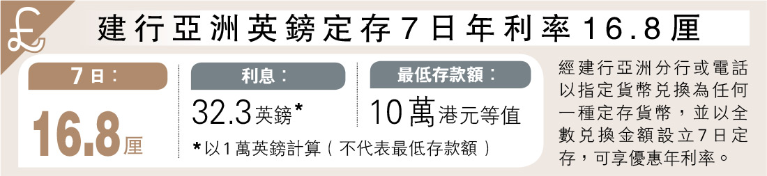 經濟 建行亞洲英鎊定存7日年利率16.8厘 發佈於 2 天 前 2025 年 11 月 7 日 By 明報 【明報專訊】經建行亞洲分行或電話以指定貨幣兌換為任何一種定存貨幣,並以全數兌換金額設立7日定存,可享優惠年利率。 日報新聞-相關報道: 富邦港元定存6個月年利率3厘 (2025-11-07) 相關文章:富邦港元定存6個月年利率3厘 (2025-11-07) 不要錯過 柏景峰最快日內開價 首推料約150伙 繼續閱讀 贊助商 猜你喜歡