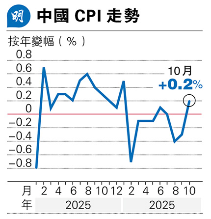 【明報專訊】國家統計局公布10月居民消費價格指數(CPI)按年升0.2%,扭轉連續兩個月通縮,同時亦勝於市場平均預期的略跌0.08%。撇去食品及能源價格的核心CPI按年1.2%,升幅連續第6個月擴大,為去年3月以來最高。國家統計局城市司首席統計師董莉娟表示,CPI按年升幅受擴內需等政策措施持續顯效,疊加國慶及中秋長假所帶動。另有分析認為,10月份CPI重回通脹受假期所推動,但通縮壓力仍根深蒂固,料增長效應將消退。