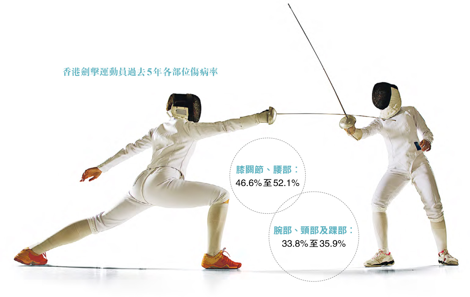 一項關於劍擊運動員損傷模式的回顧研究指出,損傷多出現於選手的優勢側,膝關節損傷率高達49%,其中負責膝部屈伸的伸膝結構(包括髕股關節疼痛綜合徵、髕腱炎)和膕繩肌拉傷佔比最高(25%和7%)。一項針對本港150名劍擊運動員的橫向研究更顯示,膝關節過度使用導致損傷的發生率達60.67%。這些數據突顯膝關節是傷患高危,尤其是專業運動員,極需加強預防措施。