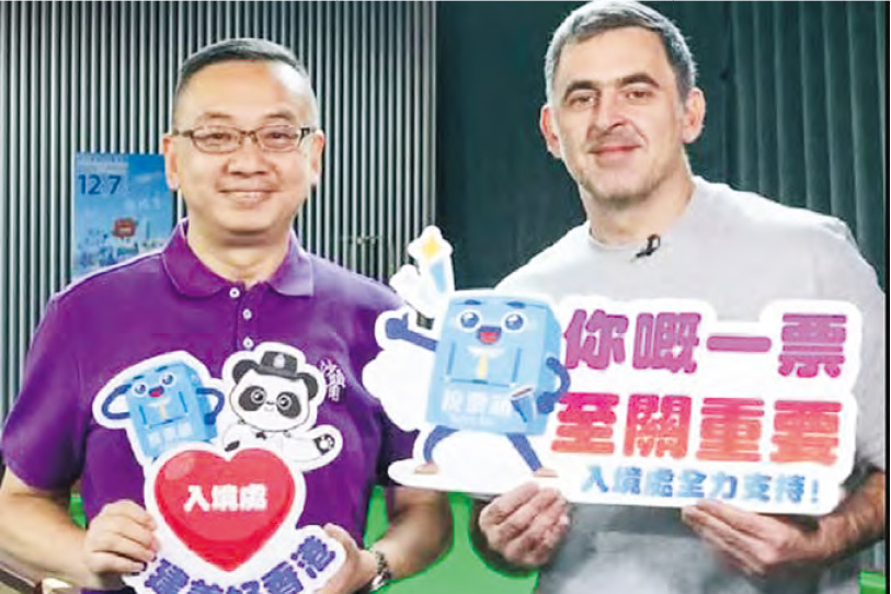 至於政府部門,入境處長郭俊峯就同舊年經優才計劃成為香港居民嘅桌球名將「火箭」奧蘇利雲拍片篤波,片段影住「12」同「7」號波,寓意12月7號選舉日,奧蘇利雲仲以廣東話呼籲投票。