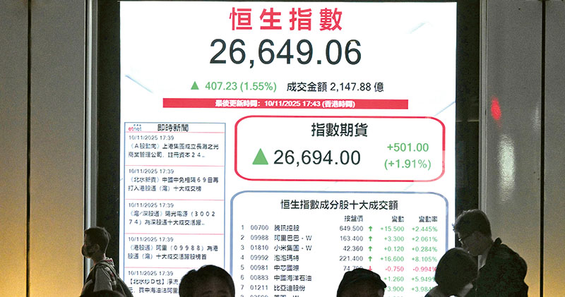 【明報專訊】美參議院通過臨時預算法案的程序性表決,華府歷時最長停擺結束在望,港股昨午後升幅急擴大,最多漲近430點,收市重上26,600點水平,創逾1個月收市新高。投資市場風險溢價降,騰訊(0700)、阿里(9988)同升逾2%,領漲科技股。財政部日前重申繼續提振消費,泡泡瑪特(9992)為首的新消費股全線勁升。