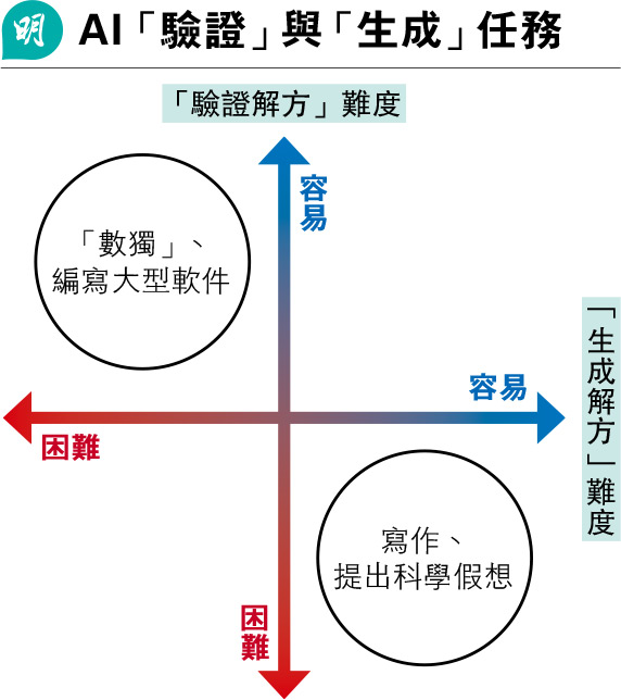 我們可以想像一個坐標圖(見圖),X軸代表「生成解方」的難度,Y軸則是「驗證解方」的難度。「數獨」和編寫大型軟件,都落在「生成難、驗證易」的象限;寫作及提出科學假想,則落在「生成易、驗證難」的象限。