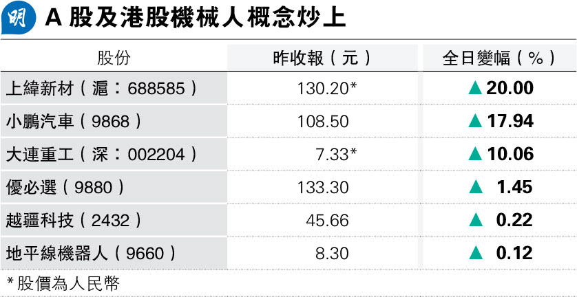 【明報專訊】內地機械人熱潮下相關企業股價受捧。早前發布新版人形機械人的小鵬汽車(9868),新技術獲好評,公司股價昨(11日)爆升18%,收報108.5元,見逾3年高位,全日高見109元。不過公司股價今年至今已累升1.4倍,市場有獲利回吐趨勢,其中北水昨日急沽小鵬約22.7億元,令再之前3日連續淨流入趨勢斷纜。同日A股亦有機械人概念股冒起(見表),加上內地當局政策催谷,顯示機械人已成當地產業重要課題。
