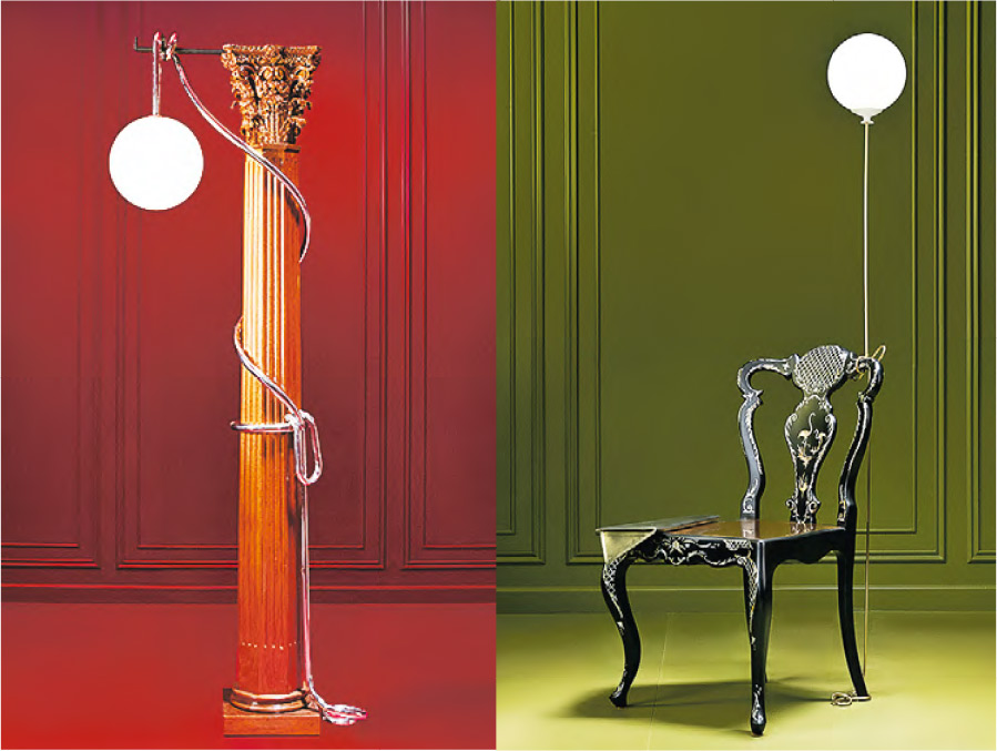 【明報專訊】以巴基斯坦為基地的Strata設計工作室,由母子設計組合Saira Ahsan和Yousaf Shahbaz主理。當中的Period Study系列,以古典作品為藍本,作為注入新元素的橋樑。整個系列最搶眼的是看似將燈飾繫於古典石柱的Column Lamp(圖a左),叫人想起美國藝術家Chris Burden於Los Angeles County Museum of Art館外的公共藝術地標Urban Light,但作品以上漆木材取代雲石,帶來更溫逸的感覺。另一個作品Party Chair(圖a右),則一如其名地將象徵節慶的氣球形態燈飾,繫於綴有貝母的古典椅椅背,並於椅面加入類似餐巾的金屬點綴,與Column Lamp一樣,以趣味方式作古今結合,同時向傳統元素和工藝致敬。
