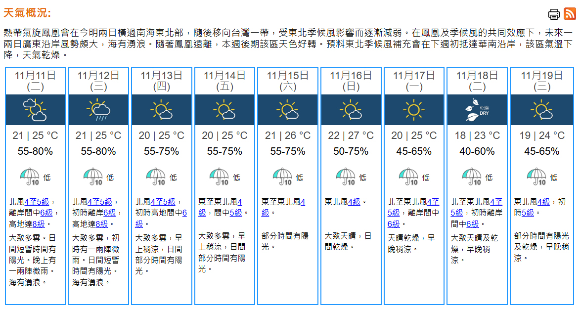 本港地區明日(11日,周二)天氣預測:大致多雲,明早稍涼,市區最低氣溫約21°C,新界再低一兩度,日間短暫時間有陽光,最高氣溫約25°C,明晚有一兩陣微雨。吹和緩至清勁北風,離岸間中吹強風,高地達烈風程度。海有湧浪。展望周三(12日)風勢頗大,海有湧浪。周四(13日)早上氣溫下降至20°C左右。本周後期部分時間有陽光。