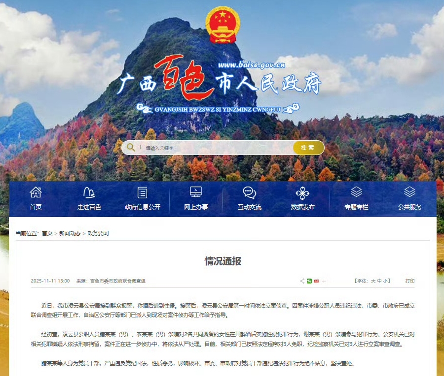 廣西百色市委市政府聯合調查組11月11日通報凌雲縣3名公職人員涉嫌實施、參與性侵犯罪有關問題。百色市凌雲縣公職人員臘XX、農XX涉嫌對2名共同聚餐的女性在其醉酒後實施性侵犯罪行為,謝XX涉嫌參與犯罪行為。