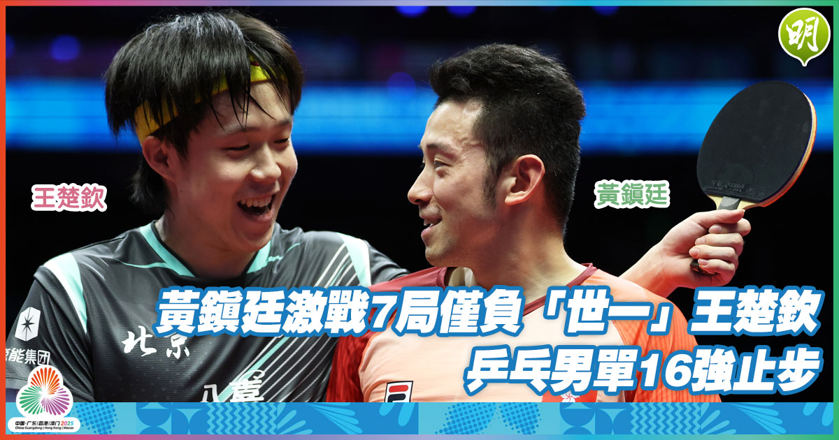 粵港澳全運會乒乓球男單16強今晚(12日)在澳門上演,港隊一哥黃鎮廷與代表北京隊的頭號種子兼「世一」王楚欽合演巔峰對決。最終阿廷力戰7局後以3:4惜負,無緣8強。