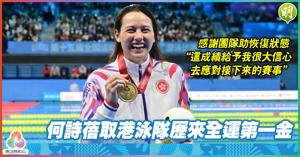 粵港澳全運會游泳項目今(13日)在深圳上演,中國香港代表隊泳手何詩蓓(Siobhan)晚間出戰個人強項女子200米自由泳決賽,率先以1分54.85秒觸池,初戰全運即在首個項目勇奪金牌,亦是港隊歷來第一面全運游泳金牌!Siobhan賽後難掩激動,直言備戰之路充滿傷病挑戰,慶幸狀態逐漸恢復令其奪冠,「這是一個很好的成績,也給我很大信心去應對接下來的賽事」。