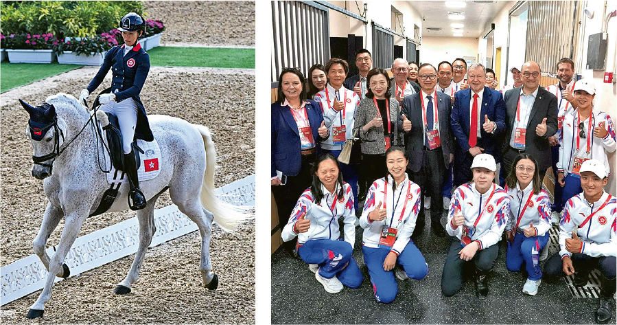 【明報專訊】粵港澳全運會馬術項目昨早在深圳光明國際馬術中心續舉行盛裝舞步個人賽,代表港隊出戰的馬會馬術隊成員何苑欣(左圖)與馬會贊助馬匹「Lord Sandro K」,最終在決賽平均以66.935分成績排第7名。馬會主席廖長江及行政總裁應家柏到深圳為賽事頒獎,並為賽事期間提供專業支援的馬會同事打氣(右圖)。金、銀、銅牌得主分別為新疆隊騎手劉濤、上海隊的徐墨菲及廣東隊的顧兵。