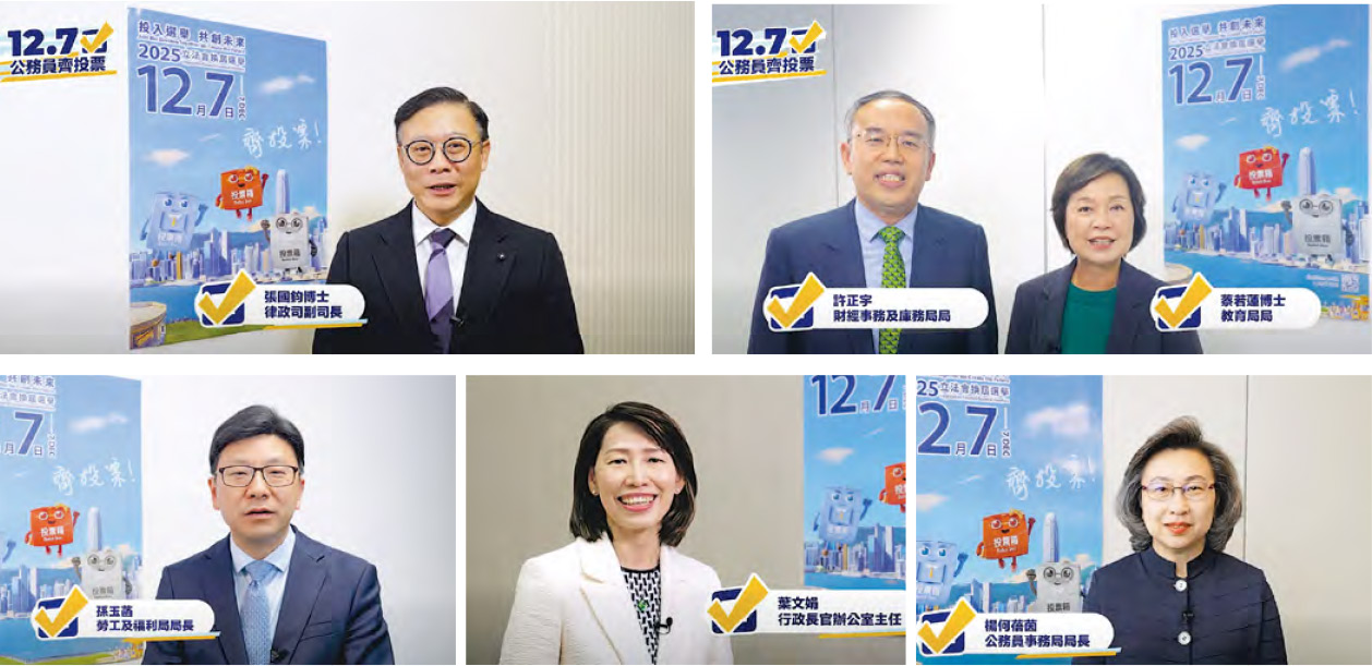 【明報專訊】距離12月7日立法會選舉日唔夠一個月,公務員事務局長楊何蓓茵噚日喺facebook上載短片宣傳,片中副司長、4名局長同特首辦官員各自以家鄉話呼籲投票,話係「家鄉話家鄉情」,相信市民無論咩祖籍都熱愛香港,為香港未來應一齊投票,又形容呢個「溫馨提示」「當然適用於一眾公務員同事」。