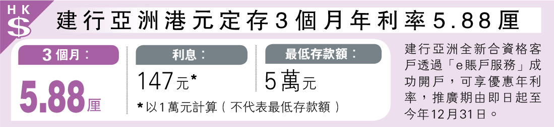 經濟 建行亞洲港元定存3個月年利率5.88厘 發佈於 2 天 前 2025 年 11 月 14 日 By 明報 【明報專訊】建行亞洲全新合資格客戶透過「e賬戶服務」成功開戶,可享優惠年利率,推廣期由即日起至今年12月31日。 日報新聞-相關報道: 富邦英鎊定存1個月年利率5.38厘 (2025-11-14) 相關文章:富邦英鎊定存1個月年利率5.38厘 (2025-11-14) 不要錯過 京東工業下月招股 集資規模擬縮近半 繼續閱讀 贊助商 猜你喜歡