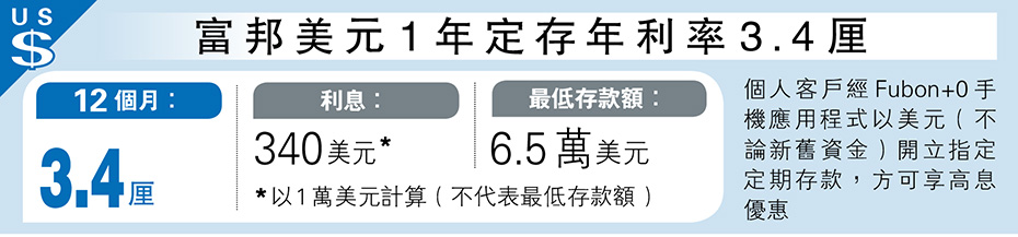 經濟 富邦美元1年定存年利率3.4厘 發佈於 2 天 前 2025 年 11 月 18 日 By 明報 【明報專訊】個人客戶經Fubon+0手機應用程式以美元(不論新舊資金)開立指定定期存款,方可享高息優惠(圖) 日報新聞-相關報道: 富融港元1個月定存年息7.88厘 (2025-11-18) 相關文章:富融港元1個月定存年息7.88厘 (2025-11-18) 不要錯過 珠江船務等 3500萬沽佐敦舖 繼續閱讀 贊助商 猜你喜歡