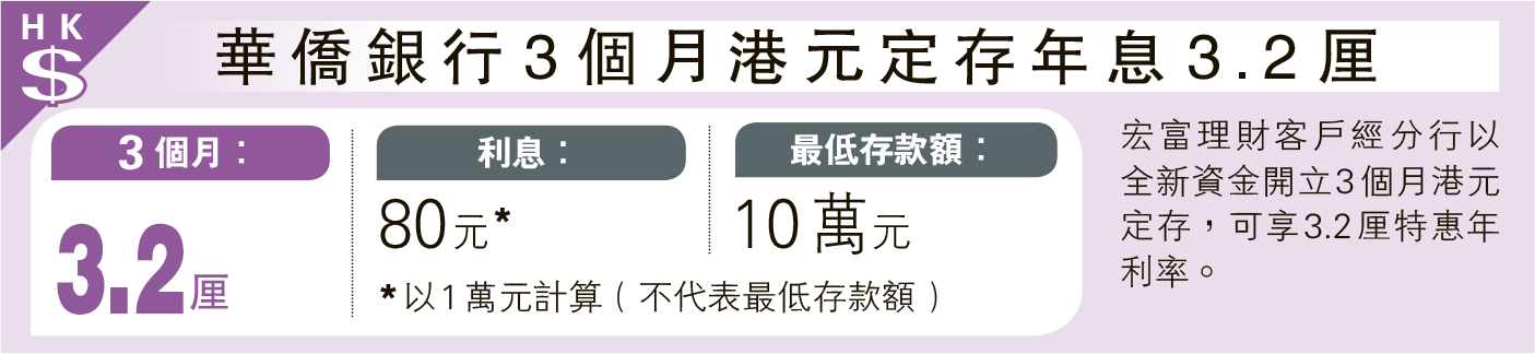 經濟 華僑銀行3個月港元定存年息3.2厘 發佈於 2 天 前 2025 年 11 月 19 日 By 明報 【明報專訊】宏富理財客戶經分行以全新資金開立3個月港元定存,可享3.2厘特惠年利率。 日報新聞-相關報道: 中銀澳元存1個月年利率3.5厘 (2025-11-19) 相關文章:中銀澳元存1個月年利率3.5厘 (2025-11-19) 不要錯過 國泰:美撤小額貨免稅累電貿放緩 東南亞需求走強 加班開航線促增長 繼續閱讀 贊助商 猜你喜歡