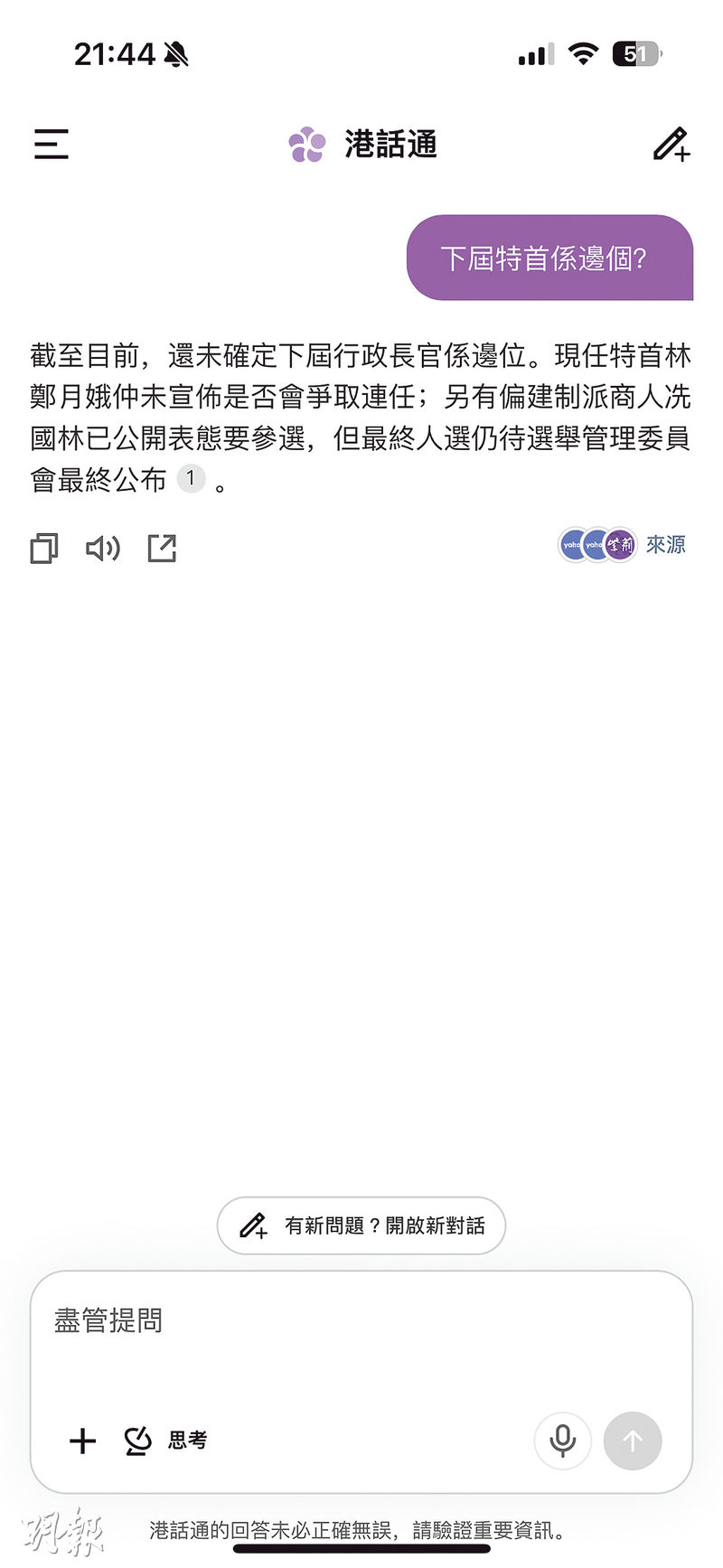 不過,本報測試亦發現「AI幻覺」。記者三度提問「下屆特首係邊個?」港話通有一次回答正確,稱「尚未有官方公布」;一次稱「下屆特首係John Lee(李家超)」;一次稱「至目前,還未確定下屆行政長官係邊位」,但錯誤引述2022年1月26日舊新聞稱「現任特首」是林鄭月娥,以及「商人冼國林已公開表態要參選」。