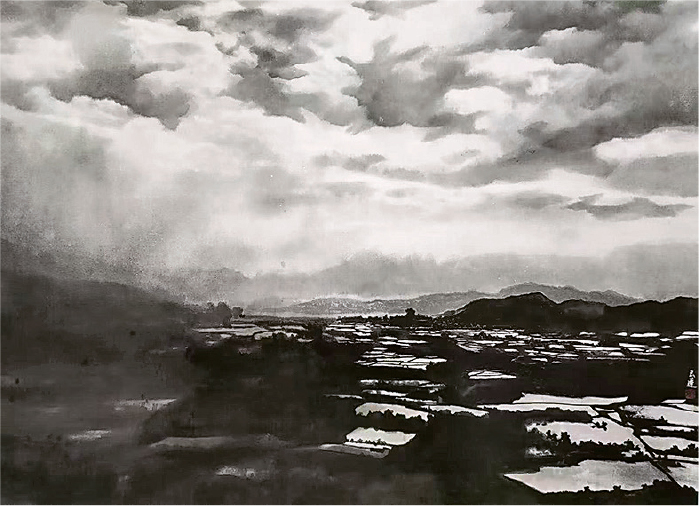 賴玉蓮師承嶺南畫派第3代傳人伍月柳,深得其藝術精髓。作品根植了深厚中國畫傳統理念,並精妙運用墨色「濃、淡、乾、濕」的變化,展現自然萬物的層次與氣韻;同時突破傳統框架,大膽將古典皴法(即用毛筆以側鋒和淡乾墨,模擬山石紋理、質感)與現代光影技巧融合。今次展出賴玉蓮多幅代表作品,包括《阡陌》、《煙雨浮雲伴我行》、《和光同行》等。畫面不僅承載東方美學的寫意精神,更充滿戲劇感的視覺張力。其畫作不僅是技法的創新,更是一場水墨畫如何「與時並進」的探索。