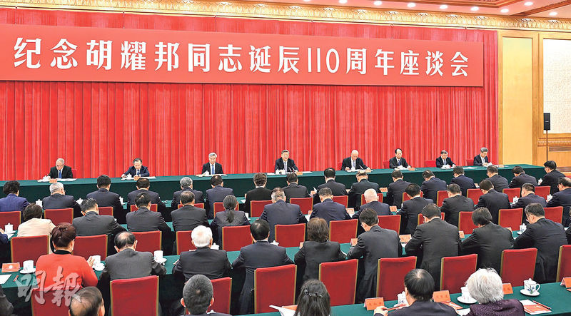 【明報專訊】中共中央昨(20日)上午在北京人民大會堂舉行座談會,紀念中共前總書記胡耀邦(圖)誕辰110周年。中共中央總書記習近平發表講話強調,要認真學習胡耀邦的崇高精神風範和優良作風,不忘初心、牢記使命,堅定歷史自信,增強歷史主動,號召全黨以一往無前的奮鬥姿態紮實推進各項事業,努力把老一輩革命家的夙願變成美好現實。這也是中共中央第三次高規格紀念胡耀邦。