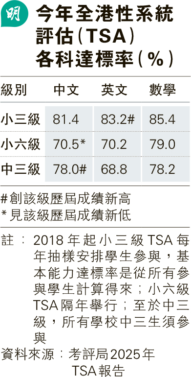 【明報專訊】考評局昨日公布今年小三、小六及中三學生在「全港性系統評估」(TSA)的中英數表現。學界去年關注小三生各科達標率皆下跌並見歷屆最低,今年該級學生表現改善,英文科達標率逾八成,創歷來新高。教育局認為各級學生各科表現保持平穩。有小學校長估計,近年推動人工智能(AI)自學,或助學生提升個別科目如英語的表現。
