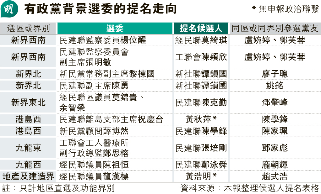 參選地區直選、功能界別或選委會界別均須取得選委提名,本報按候選人提名表格,比對政團網頁、選委申報政治聯繫等資料,至少82名候選人獲得具民建聯背景的選委提名,即佔全部161名候選人逾半,當中56人非民建聯成員;另外最少50名候選人獲工聯會背景選委提名,當中36人非工聯會成員,亦有經民聯、新民黨及自由黨選委提名非黨友候選人。