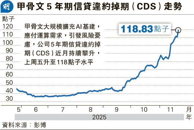 【明報專訊】為應付OpenAI運算需求,現時甲骨文亦急步擴充基建,惟其負債目前冠絕一眾科網巨擘,且客源集中於OpenAI,為公司帶來風險。截至上周,甲骨文股價已自9月高位回吐逾三成,債券價格跌約7%,其信貸違約掉期(CDS)亦升至118點子水平(見圖), 引起市場關注。