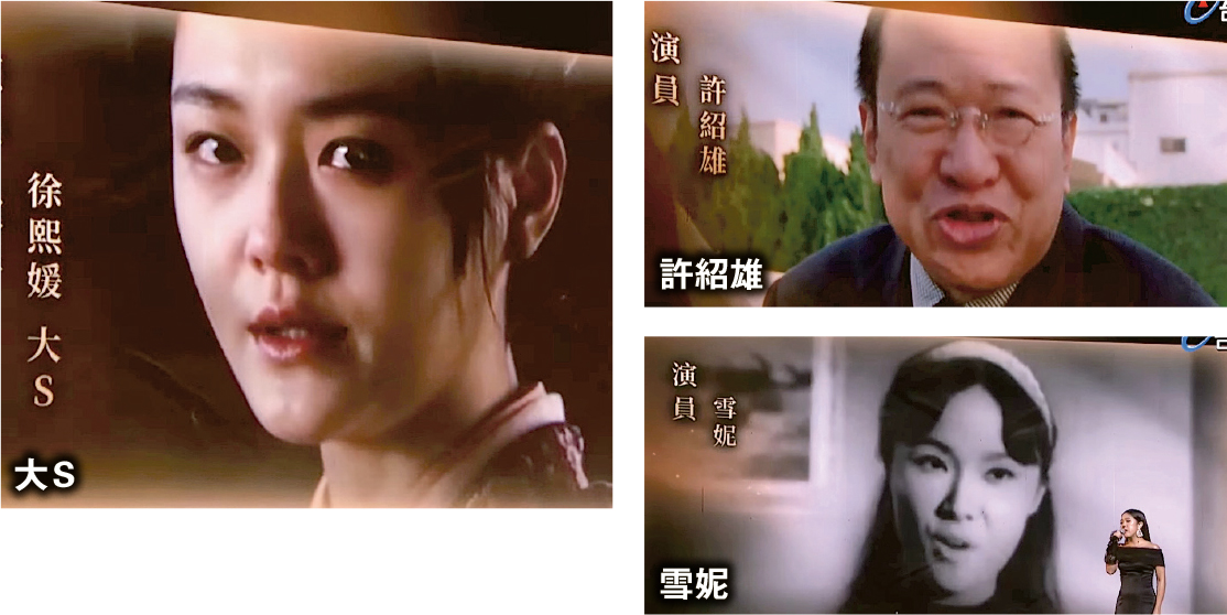 【明報專訊】金馬獎頒獎典禮其中懷念已故藝人環節,由李竺芯演唱致敬,大熒幕播出徐熙媛(大S)橫跨三金(金曲獎、金鐘獎和金馬獎)身影片段,還有其他離世藝人包括許紹雄、雪妮、唐佳、馮淬帆、夏春秋和周驄等。