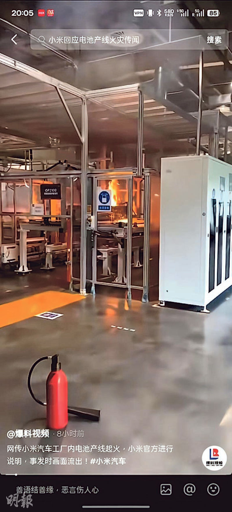 網傳汽車電池工廠起火片 小米:屬人為錯誤非技術缺陷