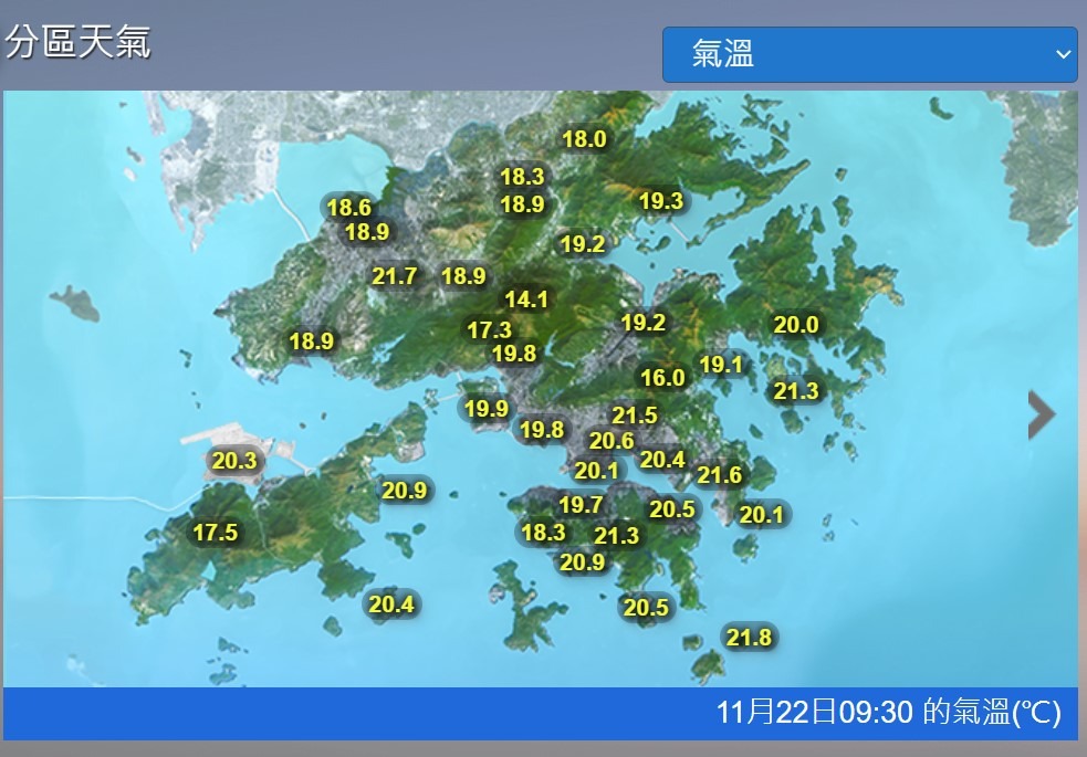 即時熱點 天氣|天文台:天晴最高24°C 未來數日持續乾燥 (09:44) 發佈於 3 天 前 2025 年 11 月 22 日 By 明報 早上9時30分,天文台錄得氣溫20.1°C,相對濕度43%。乾燥的東北季候風正為華南帶來普遍晴朗的天氣。本港地區今日(22日)大致天晴及乾燥,日間最高氣溫約24°C,吹和緩東北風。展望未來數日持續天晴乾燥,日夜溫差頗大。明日(23日)及下周一(24日)日間溫暖。下周中期早晚清涼。(天文台) 相關文章:天文台天氣天氣速遞 Up Next 圖看西藏羊卓雍湖初冬美景 (17:52) 不要錯過 好去處|城巴開篷巴H3、H4周六小童免費坐 來往中環赤柱 (17:02) 繼續閱讀 贊助商 猜你喜歡 天氣|天文台:大致天晴 最高27°C (08:15) 天氣|天文台:周一市區21°C-27°C 晚上轉吹清勁北風 (18:47) 天氣|天文台:今日天晴乾燥 市區最高氣溫料25°C (09:25) 天氣|天文台:日間部分時間有陽光 最高24°C (08:16) 下周急轉冷 市區最低13℃ 天文台:下周二顯著轉涼 下周三低見13°C (12:03)