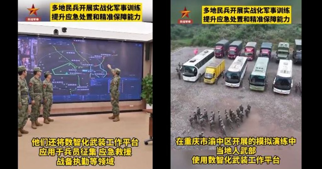 在重慶市渝中區開展的模擬演練中,當地人武部使用數碼化武裝工作平台,精準完成參戰人員抽組、裝備物資緊急調用,有序組織新域新質民兵力量參加實戰化演練。他們還將數碼化武裝工作平台應用於兵員徵集、應急救援、戰備執勤等領域,提升國防動員後備力量、援戰保戰能力。(央視軍事)