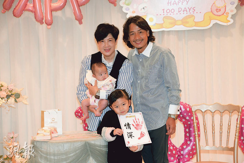 【明報專訊】58歲黃澤鋒與同齡太太陳麗麗8月再添千金,前晚為二女「小貴妃」黃熙喬舉行百日宴,筵開40席宴請親朋,開席前舉行長女「小黃妃」黃熙恩胎毛筆開筆和「小貴妃」製作胎毛筆儀式,二人打手印及腳印,寓意姊妹情深。黃澤鋒榮升兩女之父,湊女生活更忙,每天接送大女上學放學後便教游水,餘下時間照顧細女,「辛苦但開心,這年紀有兩個女好感恩同非常開心。大女考第4名,成續好好,還幫手湊妹妹,個鼻最堅,索一索就知妹妹要不要換片,最好是她沒妒忌,我和她說爸爸愛她和妹妹無分彼此,對小朋友不能偏心」。